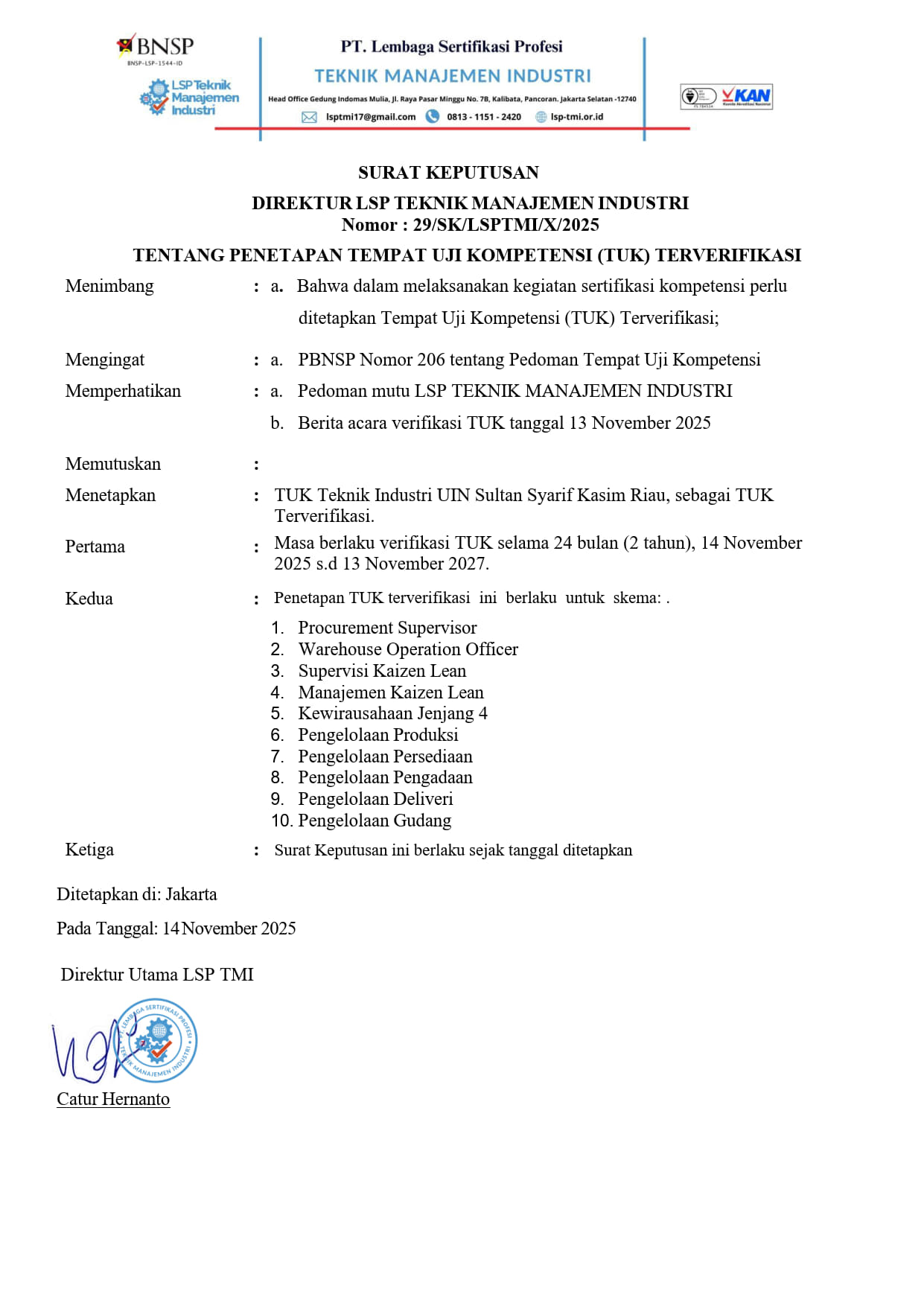 SK Penetapan Tempat Uji Kompetensi (TUK) Terverifikasi LSP Teknik Manajemen Industri